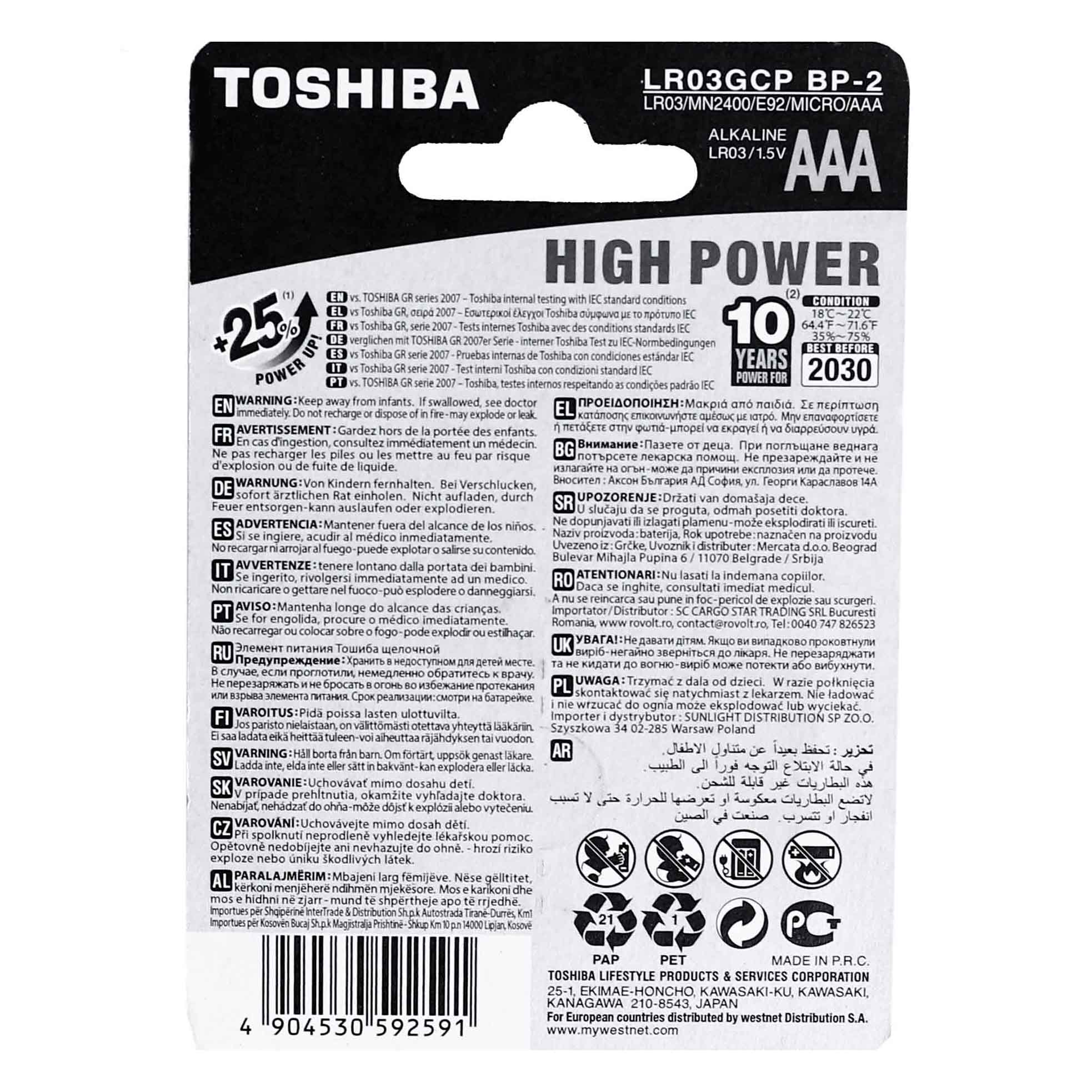 باتری قلمی آلکالاین توشیبا مدل High Power بسته 2 عددی